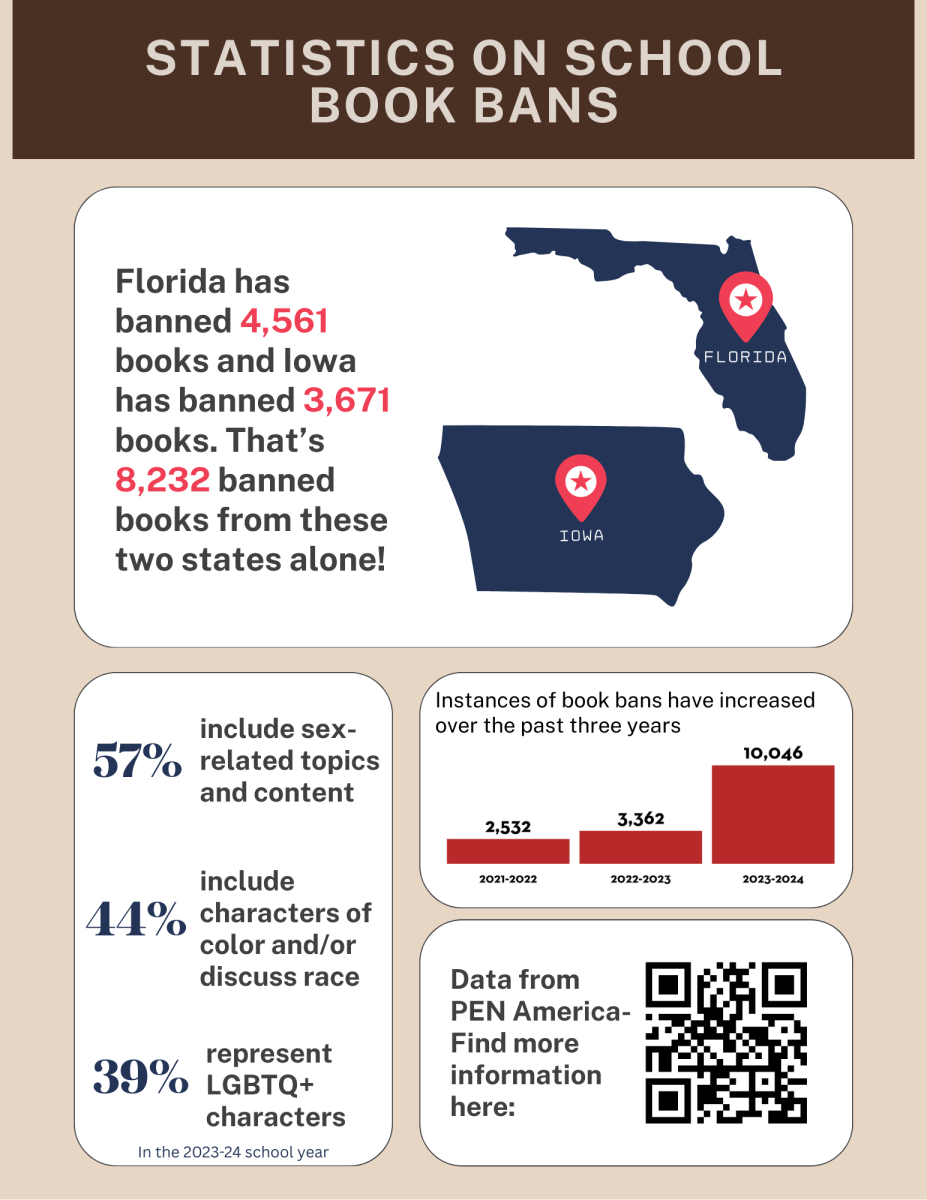 As of the 2023-2024 school year, Florida has one of the highest numbers of banned books, with 4,561 instances; Iowa follows with 3,671 instances (PEN America, 2023). These two states alone have 8,232 books banned. In May 2023, Iowa passed a law, Senate File 496, that requires all materials and school books to be “age-appropriate,” but this prohibits “books with depictions of sex as well as all materials and instruction involving ‘gender identity’ and ‘sexual orientation’ for students through sixth grade.” Fairly after that law came into place, “the Urbandale Community School [in Iowa] has taken what it calls the broadest possible interpretation of the law,” ordering to remove nearly 400 titles from its district libraries and classrooms that were deemed to violate SF496 (PEN America, 2023). Some of these books include The Family Book by Todd Parr, The Hate U Give by Angie Thomas, The Handmaid’s Tale by Margaret Atwood, and 1984 and Animal Farm by George Orwell, among others (PEN America, 2023). On March 25, 2025, Judge Stephen Locher blocked part of this law after providing a temporary reprieve to publishers who have sued the state for blocking their books in school libraries and classrooms that “depict sex acts.” Locher states, “that the unconstitutional application of the book restrictions ‘far exceed’ the constitutional applications under both legal standards the Court believes are applicable.” (Omaha World-Herald)